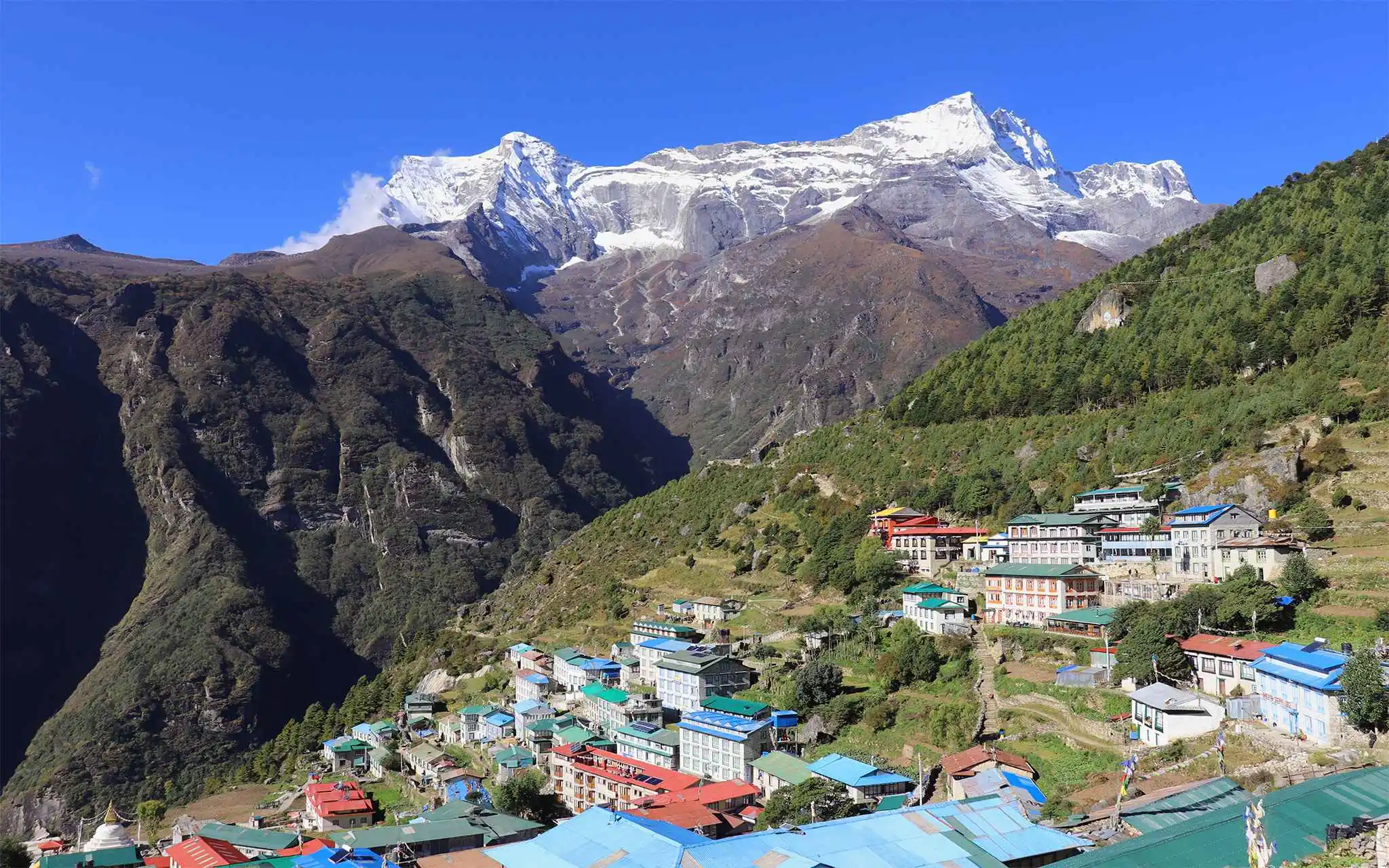After breakfast at the teahouse, we start our longer and tougher day to Namche than previous. The first part is along the river Bhote Koshi in the beautiful forest stretch. You cross several suspension bridges. The last part after lunch is steep uphill for about good two hours. This effort will be rewarded by spectacular beauty of Namche bazar and the view of the Himalayan peaks from here. This homeland of famous climbing tribe Sherpas who migrated to the Everest region crossing the Himalayas centuries ago. Arrive Namche. Chek-in to your Hotel. Overnight at Namche Bazar.